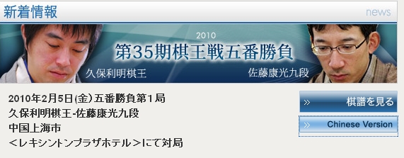 から撮ったものだが、右下を見ると、Chinese Version とある。上記のリンクをクリックして、中国語でのネット中継を見ることができるようになっている。50万人いると報じられている上海の将棋ファンにとってもこれは朗報だろう。<2/8追記>